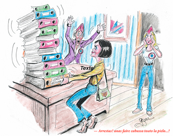 - lou mounde di gènt que gouvernon en Prouvènço es pas en rèsto, lou presidènt de la Regioun Prouvènço-Aup-Costo d’Azur a mes sa placo, mita escricho, en prouvençau sus la muraio de soun hotel, lou presidènt dóu despartamen di Bouco-dóu-Rose, éu, a fa parié, e li conse de touto meno an segui, se parlon pas prouvençau dins sis emicicle, acò vai veni, lis aparaire de la lengo an jamai agu tant de mounde en cadiero dins lis acamp dóu Counsèu Regiounau coume dins aquéli di Counsèu Generau, emai di municipe, coumunauta de coumuno, coumunauta urbano e groupamen intercoumunau que fan boui-boui en subre-mountacioun de sa representativeta territourialo,